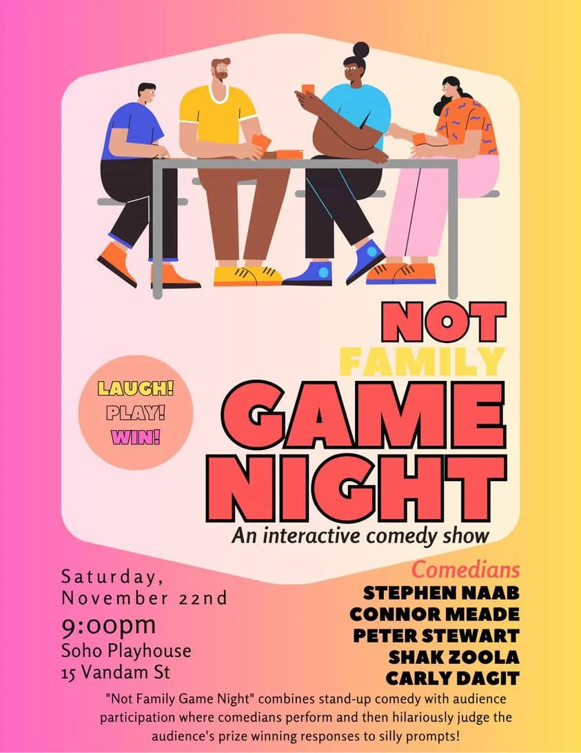 Not Family Game Night combines a live stand-up comedy show with a group card game. Audience members receive playing cards as they enter, and have a chance to win prizes by using their cards to respond. Each comedian hilariously judges the audience’s responses to funny prompts; think Cards Against Humanity, but all created from the minds of New York comedians and YOU, the audience. This one-of-a-kind show is hosted by Shak Zoola (@shakzoola) and Carly Dagit (@carlyhatesinsta). Comics performing this month include Stephen Naab, Connor Meade, Peter Stewart, and more!